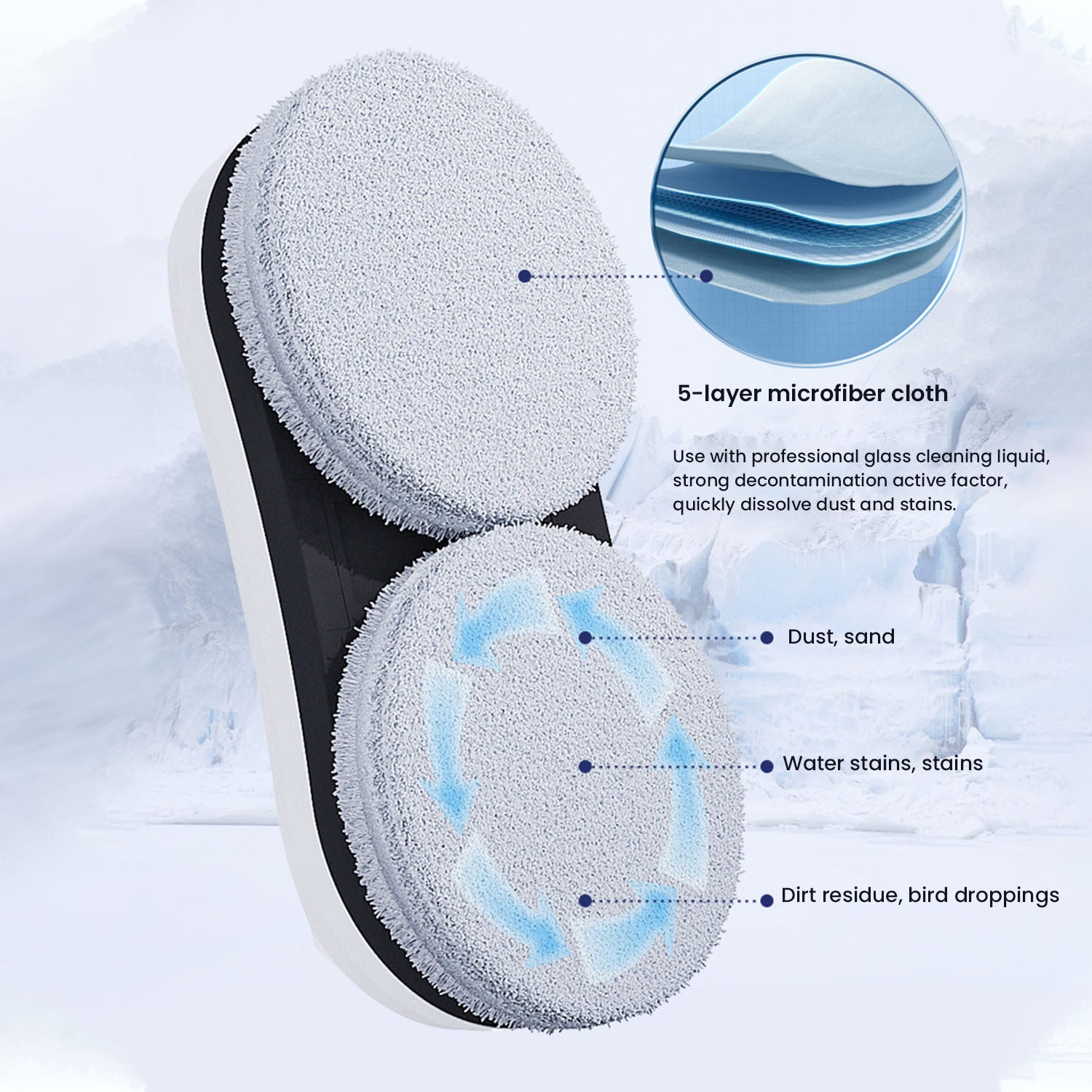 - Replace the clean fiber mat of the glass window cleaner robot and spray 2-3 times with water or glass cleaner (if the fiber mat is too wet, the magnetic window cleaner will slip) to clean the window (We provide a water spray bottle). Then, the high-quality eco-fiber mat will not leave marks on the glass surface.