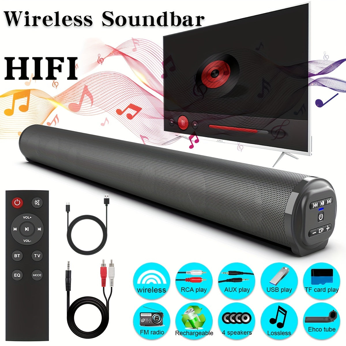 Package Contents:Long Soundbar Audio (BS-10)*1Remote Control*1Type-C Charging Cable*1English Manual*1RCA cable for left and right channel*1