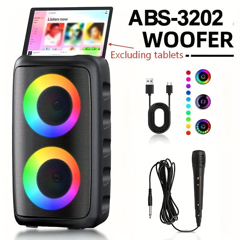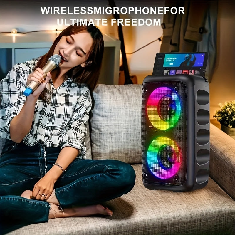 Portable Wireless Speaker with 2 Microphones and a Subwoofer, Featuring a Built-in 2400mAh Battery, Disco Lights, Version 5.0, Dual 3-inch Wireless Subwoofers, FM, MP3, TWS, Wireless Connectivity, and TF Card Playback Capabilities, Making It an Ideal.