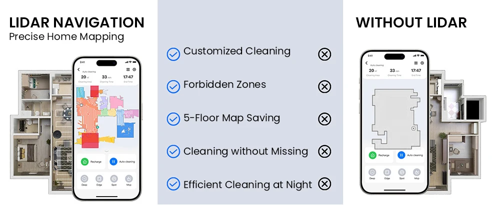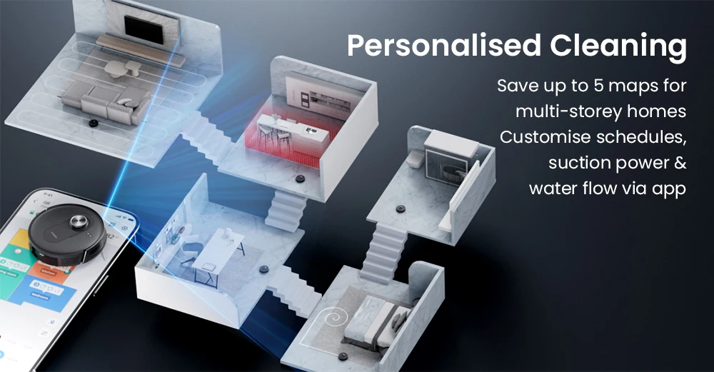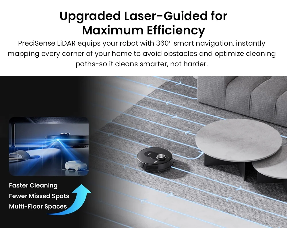 The upgraded LiDAR system maps your entire home in just 15 minutes, delivering accurate layouts day and night. Save up to 5 floor maps and customize cleaning preferences for each level, from room-specific cleaning to targeted zones.