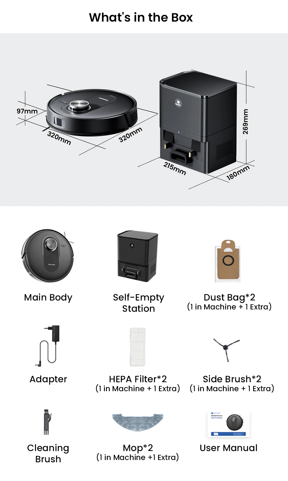 1 x Main Body 1 x Dust Collection Station 1 x Adapter 2 x HEPA Filter (1 in Machine + 1 Extra) 2 x Side Brush (1 in Machine + 1 Extra) 2 x Dust Bag (1 in Machine + 1 Extra) 1 x Cleaning Brush 2 x Mop (1 in Machine + 1 Extra) 1 x User Manual
