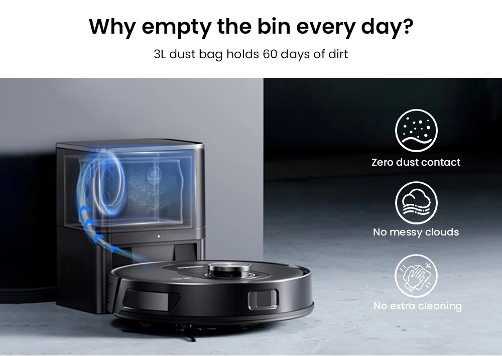 Experience true convenience with an integrated vacuuming, mopping, and self-emptying system. The auto-empty station collects debris each time the robot docks, and the 3L large dust bag holds up to 60 days of dirt. No more daily emptying or allergen exposure—enjoy a cleaner home with minimal maintenance.